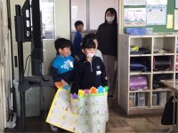 図画工作の学習では、家庭から持ち寄った材料を使って、オリジナルの筆をつくりました。子どもたちはアイデアをひねり出し、思い思いの筆をつくっていました。