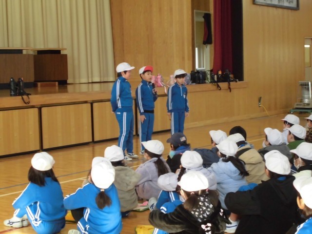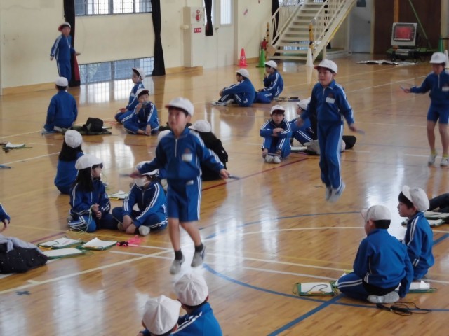 時間内に合計で何回跳べたかを記録する「コンテスト種目」と、続けて何回跳べたかを記録する「行健種目」があり、児童はそれぞれ自分で決めた跳び方で挑戦しました。自己目標を達成した児童が多く、親御さんの応援もあり、力っぱい跳ぶことができました。後日、記録証が配付されます。開会式、閉会式では係になった児童が「がんばり宣言」、「感想発表」などを堂々と発表しました。