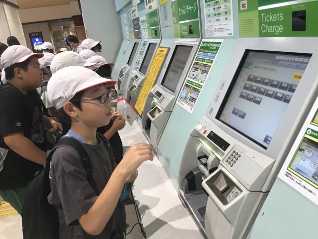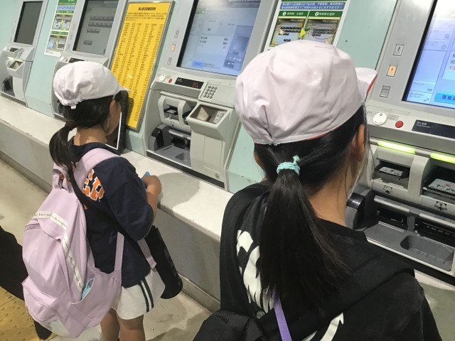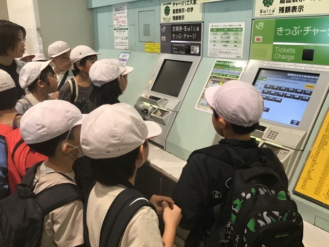 4年生は、電車に乗って郡山駅に来ました。帰りの切符を一人一人が購入しています。