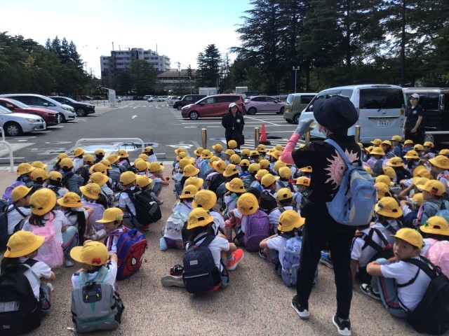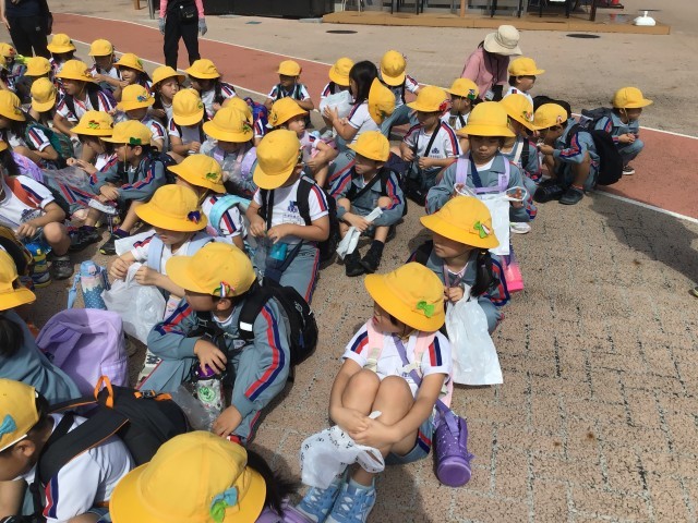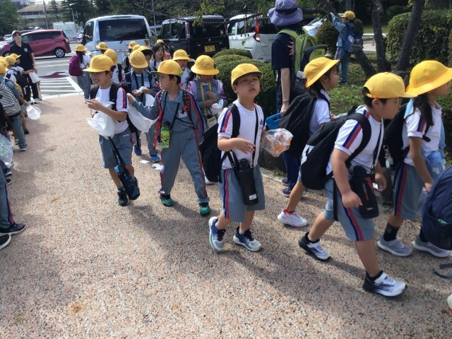 開成山公園につきました。これから、どんぐりをいっぱい拾います。どんぐりを入れるビニール袋を準備して出発します。
