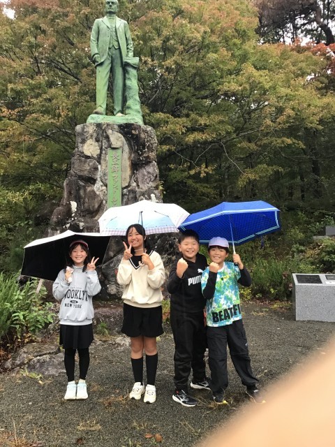 十六橋水門を見学しました。あいにく急に雨が降ってきてしまったので、ファンドールンの銅像の前で記念写真を撮って、猪苗代総合体育館へ。おうちの方に作っていただいた美味しいお弁当を食べて、一休みです。
