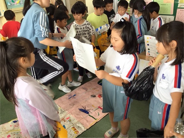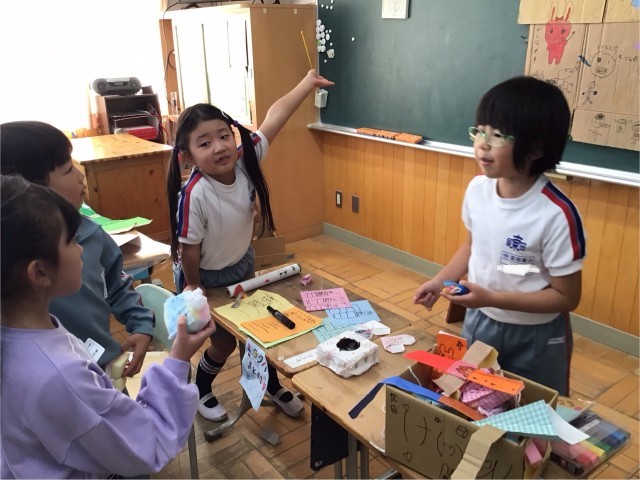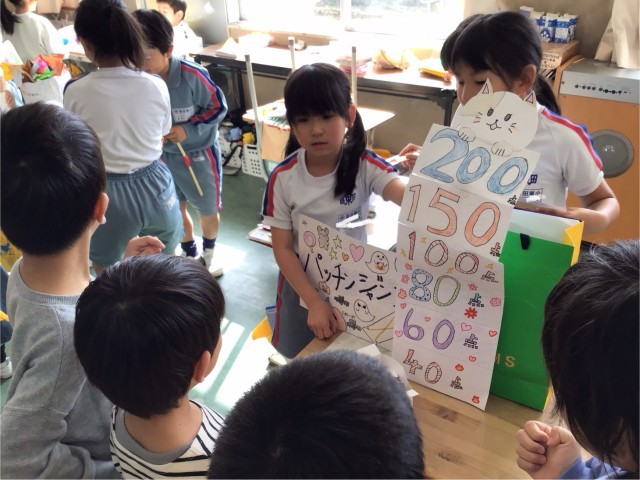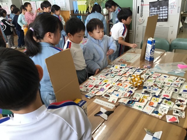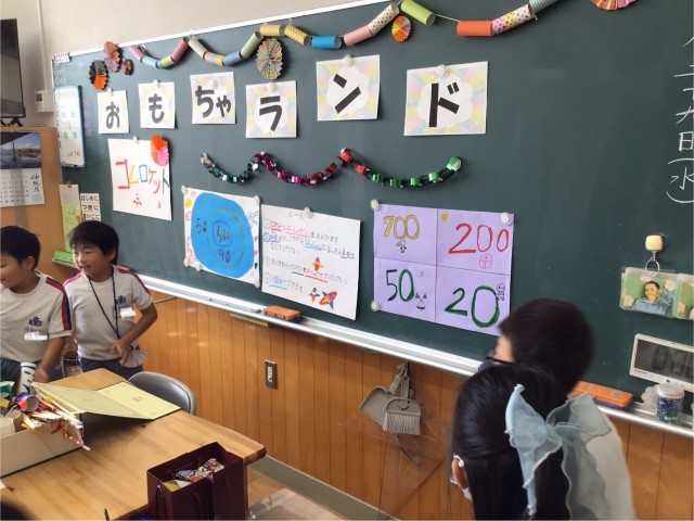 今日の3校時目に2年生が生活科の学習で取り組んでいるおもちゃランドに1年生を招待しました。2年生の子どもたちが友達と一緒に工夫を凝らして作ったおもちゃコーナーに1年生の子どもたちは目をキラキラさせながら集まりました。「いらっしゃいませ。」「これは、こうやって遊ぶんだよ。」「じょうず!じょうず!」など2年生の1年生への上手な声かけに感心しました。おもちゃランドは11月1日の東っ子DAYでも保護者の皆様に見ていただく予定です。