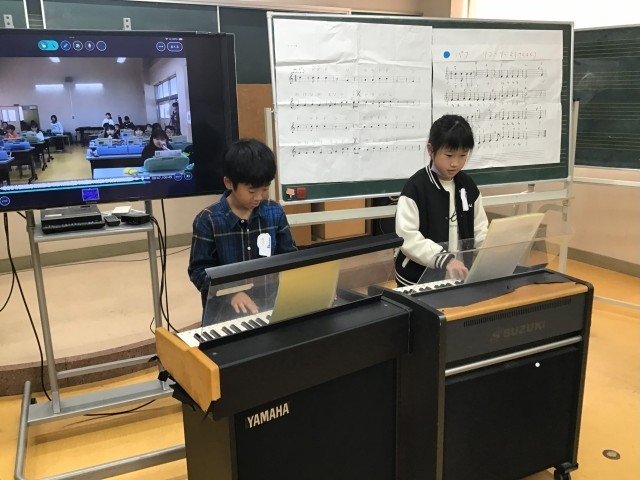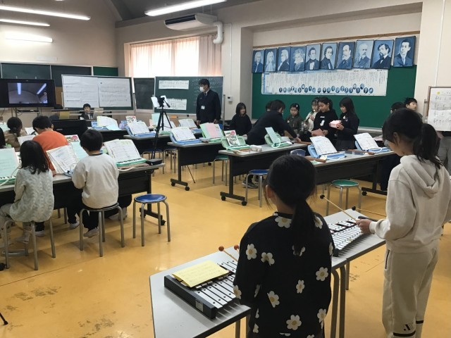 昨日の3年生の音楽の学習の様子です。3年生は、現在「パフ」という曲の合奏に取り組んでいます。前の時間の演奏を担任の先生に聴かせてもらい、「もっと、上手に演奏したい!」というめあてをもった子どもたち。リコーダー、鍵盤ハーモニカ、鉄琴、バスマスターのパートに分かれて練習を始めました。「主旋律のリコーダーがもっと響くにはどうしたらよいか。」「もっとやさしい音がいいな。」など子どもたちが相談しあいながら練習をしました。授業の最後にみんなで合わせ、先生が録音した音を聞いた子どもたち。「グッド!」「わあ上手になってる。」と満足感いっぱいの笑顔を見せてくれました。