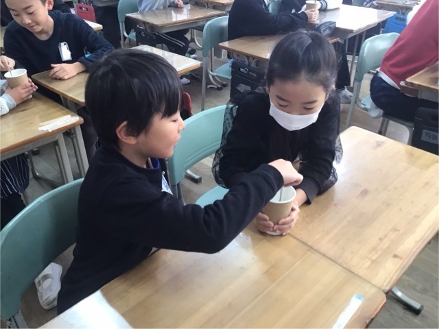 4年生は、理科の学習で「物のあたたまりかた」の学習をしています。今日は、紙コップにお湯を注ぎ、その中に金属製のスプーンを入れ、どのようになるのかを実験しました。先生の「そぉっと触ってごらん。」という言葉かけで、子どもたちはスプーンを紙コップから取り出して、持ち手の方から触ってみました。「わあ。温まってるよ。」「下のほうを触るとだんだん熱くなってるよ。」などと呟きながら、実験の結果をまとめていきました。実験は次の時間も続きます。物の温まり方の不思議をたくさん見つけてほしいです。