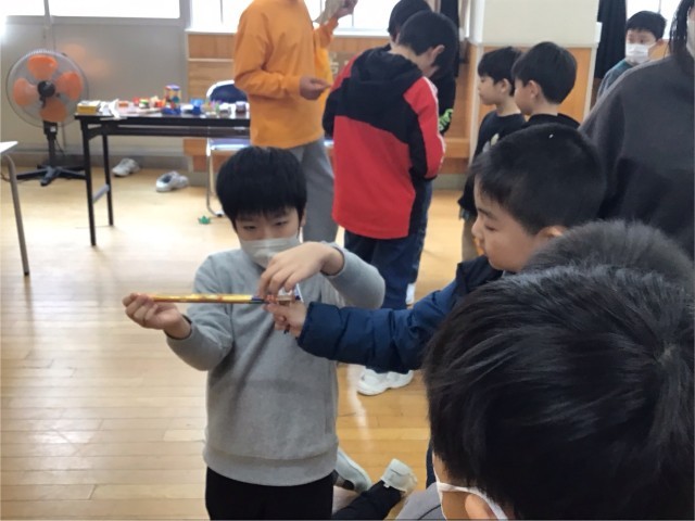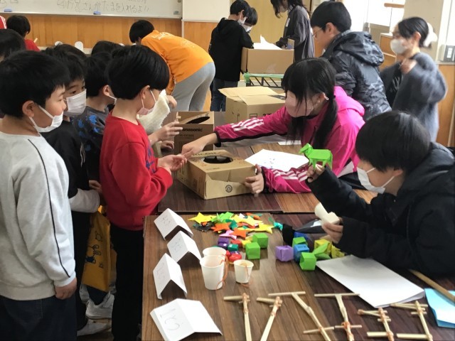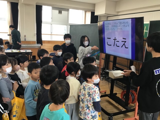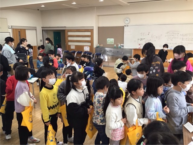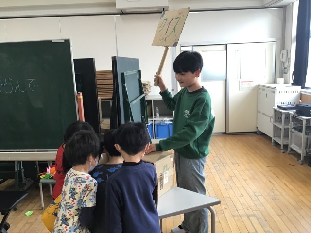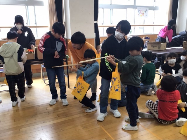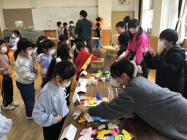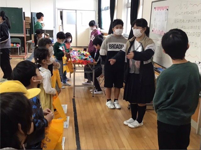 今日の3、4校時目に6年4組の企画による1年生とのお楽しみ会が行われました。これは、学級会での話し合いで子どもたちが提案、企画、運営をしたものです。射的、じゃんけんゲーム、クイズ、ジェスチャーゲームなどの楽しいコーナーや手作りの素敵な景品が用意されていて、1年生も大喜びでした。6年生と1年生のふれあいはとても心あたたまる光景でした。
