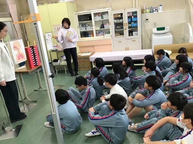 身体測定の前に保健室の先生がミニ保健指導をしています。今回は、「せん毛の働き」についてのお話をしました。のどにはせん毛というものがあり、せん毛はのどからばい菌が入るのを防いでいます。冬になり、空気が乾燥すると、せん毛の動きが鈍くなります。そのため、のどからばい菌が侵入しやすくなります。ばい菌の侵入を防ぐためにも喉を潤すためのうがいやマスク、加湿などが大切です。子どもたちは、保健室の先生方がわかりやすく、楽しい教具を使ってお話をしてくれたので、楽しみながら集中して聴くことができました。学んだことを活かして寒い冬を元気いっぱいで過ごしてほしいです。