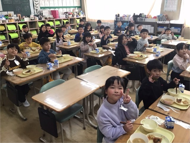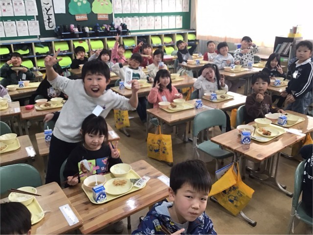 今日は、給食に郡山市の名産である鯉の唐揚げがでました。カラッとあがった唐揚げに甘じょっぱいタレがついて、とても美味しかったです。写真は、1年生の子どもたちの写真です。「鯉、おいしい😋」