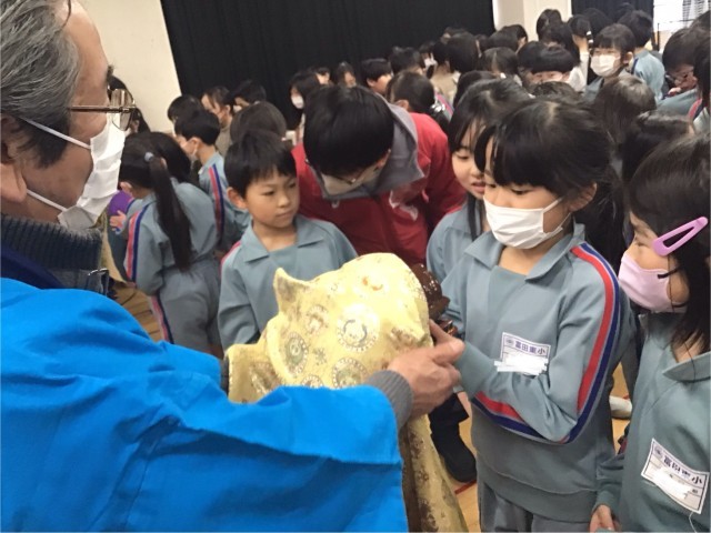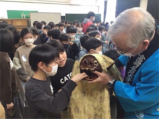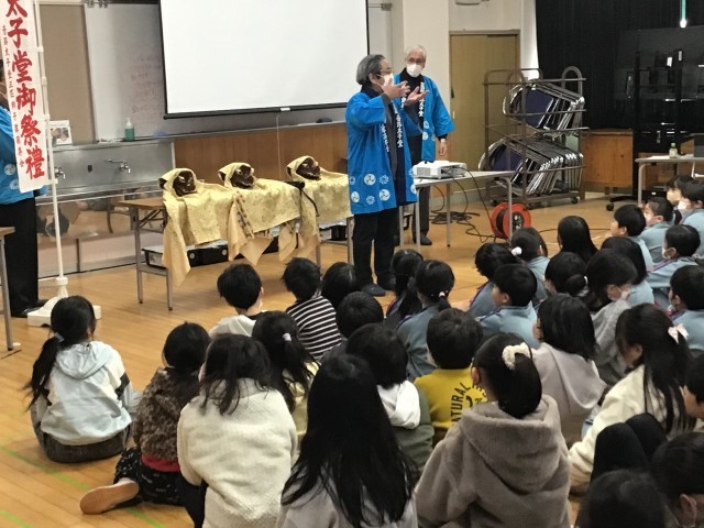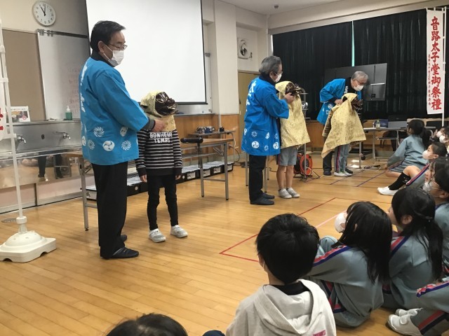 郡山市の重要無形民族文化財である音路太子堂三匹獅子舞の学習を3年生の子どもたちが行いました。音路太子堂三匹獅子舞保存会の皆様を講師にお迎えして音路太子堂の歴史や三匹獅子舞について詳しくお話をしてくださいました。獅子舞の様子をビデオで見たり、3つの獅子頭に触らせてもらったりして自分たちの学区に伝わる祭についての理解を深めていました。