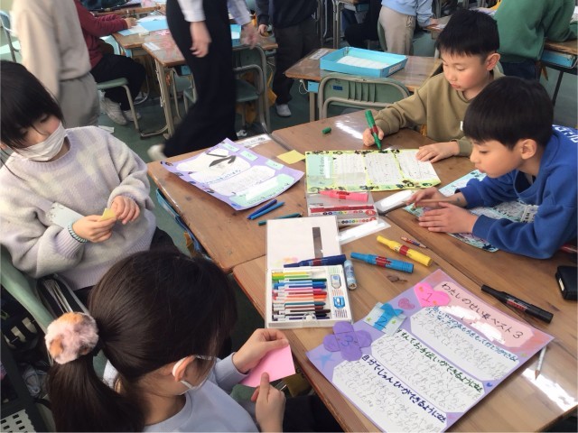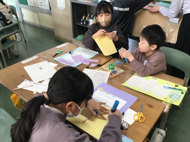 2校時目、2年生の教室では、一人一人が画用紙に一生懸命書き込んでいました。内容は、「できるようになったことベスト3」子どもたち一人ひとりが自分ができるようになったことの中から3つ選んで、まとめていました。「早起きができるようになった」「計算ができるようになった」など自分の頑張りをまとめていました。