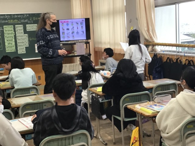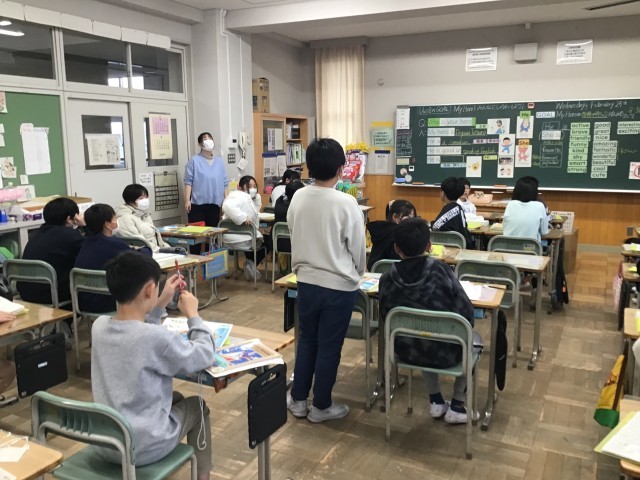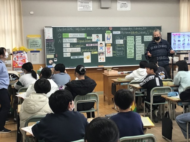 5年生の外国語の授業の様子です。今日は、「マイヒーローを紹介しよう」というめあてで学習をしました。自分にとってのヒーローを発表し、その理由も英語で話すことができました。