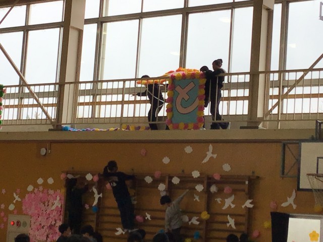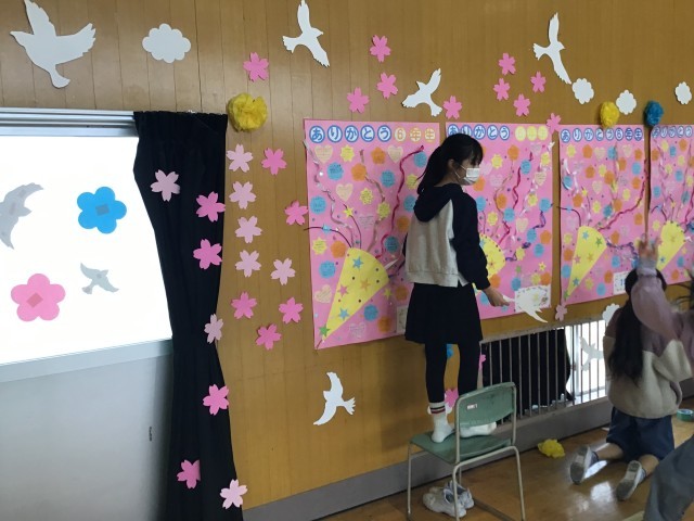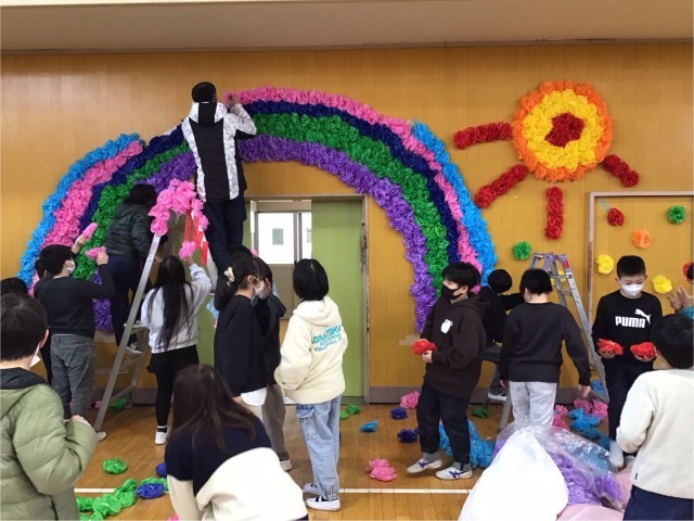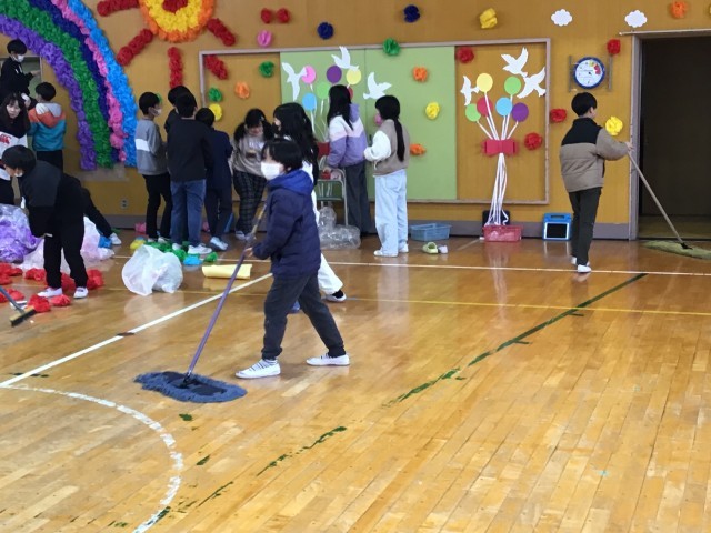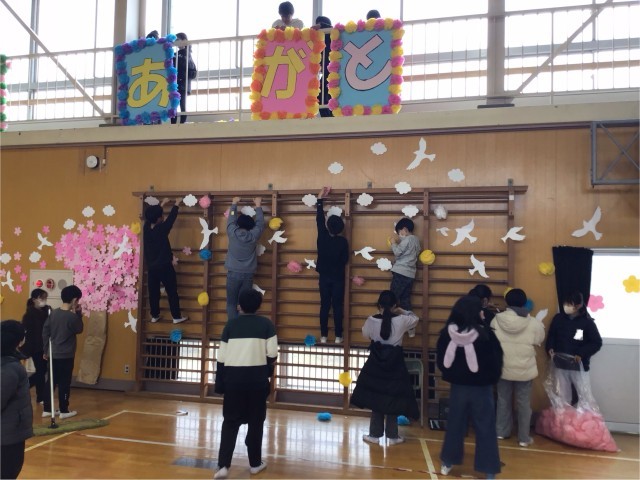 明日の6年生を送る会に向けて5年生の子どもたちが会場の体育館をきれいに飾り付けしてくれました。みんなで力を合わせて短時間で素敵な会場ができました。5年生の気持ちは6年生にきっと届くと思います。ありがとう!5年生の皆さん!