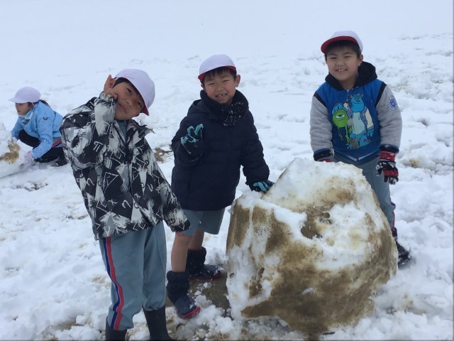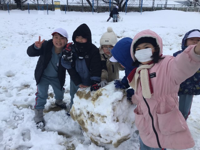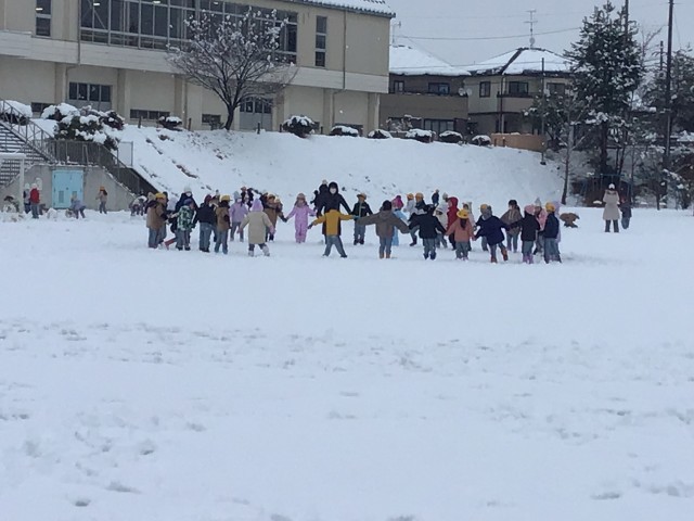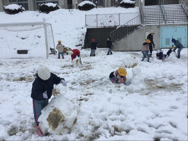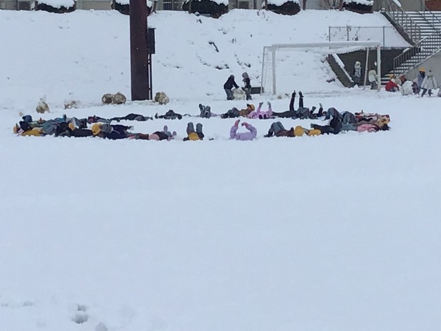 今日は、雪がどっさりふりました。1校時目に1年生の子どもたちが、生活科の学習で雪遊びをしました。誰も遊んでいない綺麗な雪の上に寝転んだり、大きな雪玉を作ったりして、雪の感触を楽しんでいました。