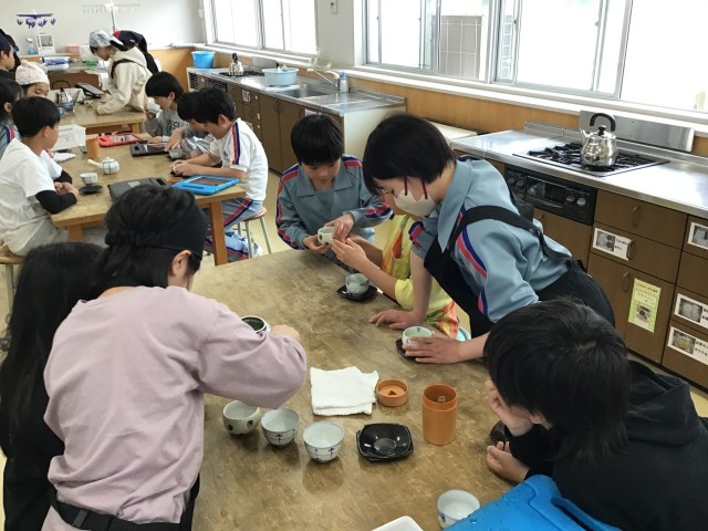 家庭科室では、5年生がお茶の入れ方の勉強をしていたよ。