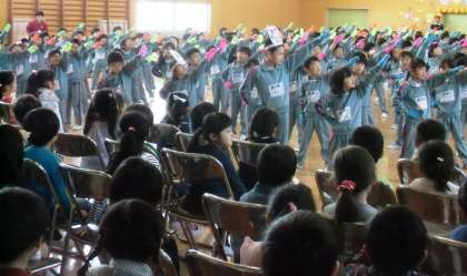 その後、歌や踊り、リコーダー演奏、よさこい、鼓笛演奏などを、各学年ごと1年生の前で披露しました。どの学年も、1年生に喜んでもらおうと、呼びかけをしたり、クイズを出したり工夫を加えていました。