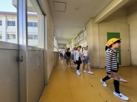 2年生のお兄さんお姉さんが1年生を優しくリードして学校を案内しています。
