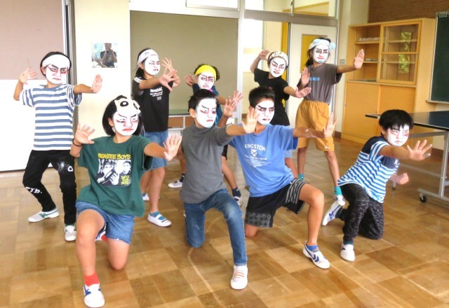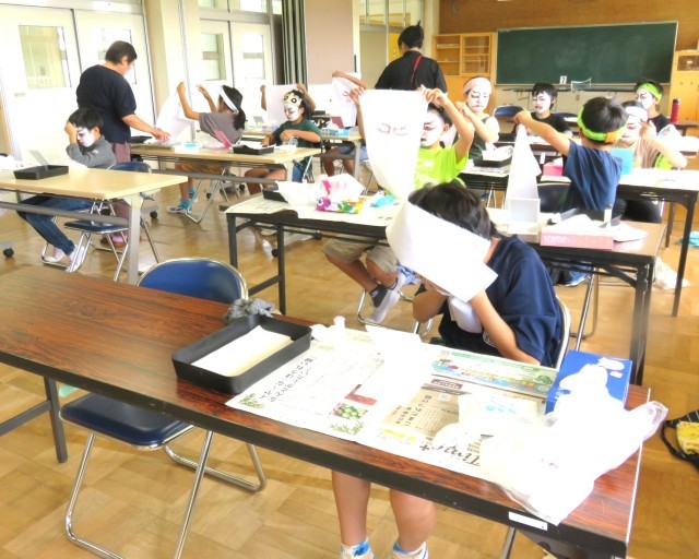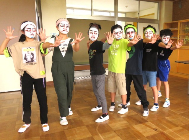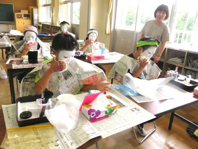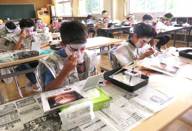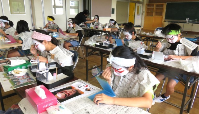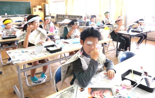 5・6年生が歌舞伎の化粧に挑戦しました。とても難しかったですが、真剣に取り組み、ひとりひとり個性的な歌舞伎の化粧ができました。白塗りはむらなく塗り上げるのが難しく、赤や黒の線を入れるときにはどこまでどのぐらいの太さでいれればよいのか戸惑いながらもみんな一生懸命取り組んでいました。最後には晒布に化粧(隈取)を写して作品にしました。地域コーディネーターの根本さんのご指導のおかげで充実した活動ができました。伝統文化に触れる貴重な時間になりました。