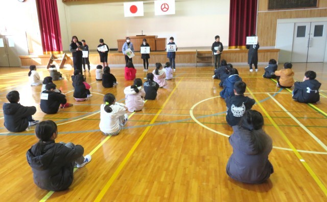 82日間の2学期が終了しました。たくさんの行事や毎日の学習や諸活動にみんなで精いっぱい取り組んできました。終業式では1・3・5年生の代表が、今学期頑張ったことと冬休みの目標について発表し、みんなで2学期を振り返ることができました。式の後には冬休みの生活について「お金と時間」をテーマに約束事の確認をしました。最後には体育館にサンタさんたちも登場し、素敵なクリスマスプレゼントをいただきました。笑顔で2学期を締めくくることができました。