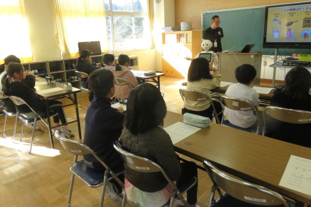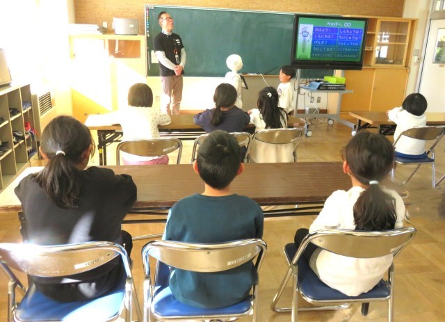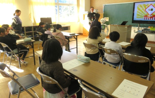 今日はみんなが楽しみしていたPepperとの学習の日でした。講師の先生がおいでになり、各学年ごとに学習しました。1・2年生はじゃんけんをしたり会話をしたり、Pepperとどんなことができるのかプログラミング体験学習をしました。3・4年生は環境(生活ゴミ)について5・6年生は情報モラル(動画配信の問題)についてPepperと一緒に学ぶことができました。