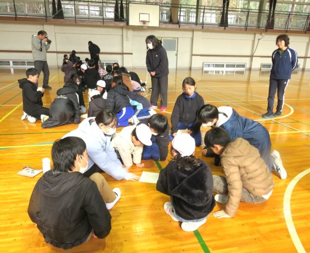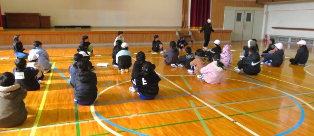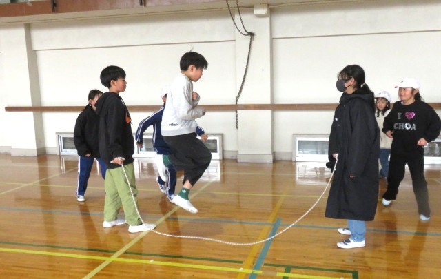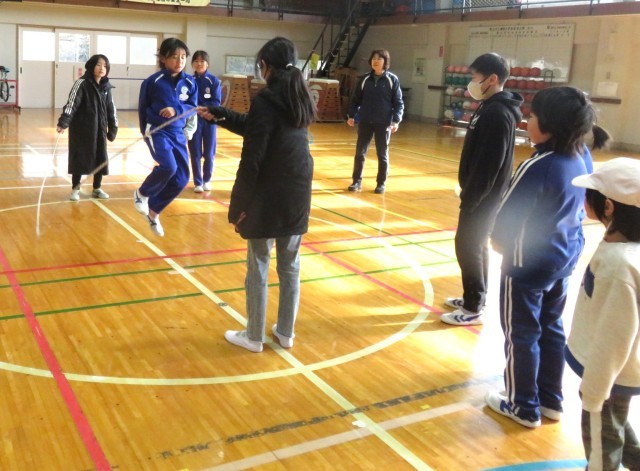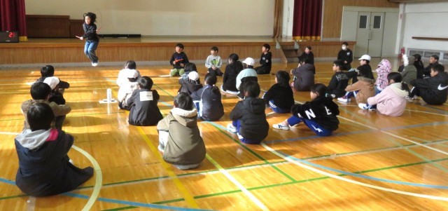 お昼休みに縄跳び記録会に向けての説明の会が開かれました。体育委員会のメンバーが種目の演示や練習の取組等について説明をした後、なかよし班ごとにチームの目標や今回のチーム名の決定を行いました。目標決定後は、早速、団体競技の長縄跳びに挑戦しました。上級生がタイミングの声掛けをしながら練習に取り組んでいました。