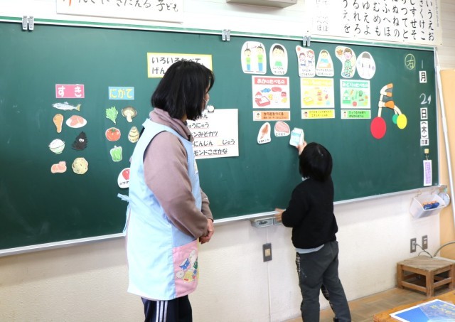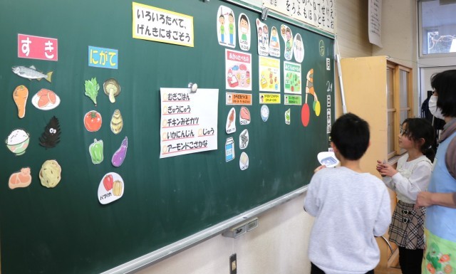 「いろいろたべてげんきにすごそう」をテーマに学習に取り組んだ1・2年生。栄養教諭の先生と一緒にいろいろな食物の働きを学びました。これからの食生活にいかしていってほしいと思います。