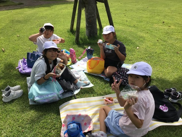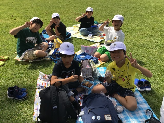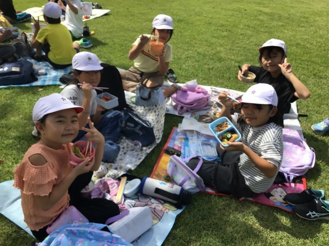 3年生は、大安場公園でお弁当を食べています。晴天の下、芝生の上で食べるお弁当は最高ですね!