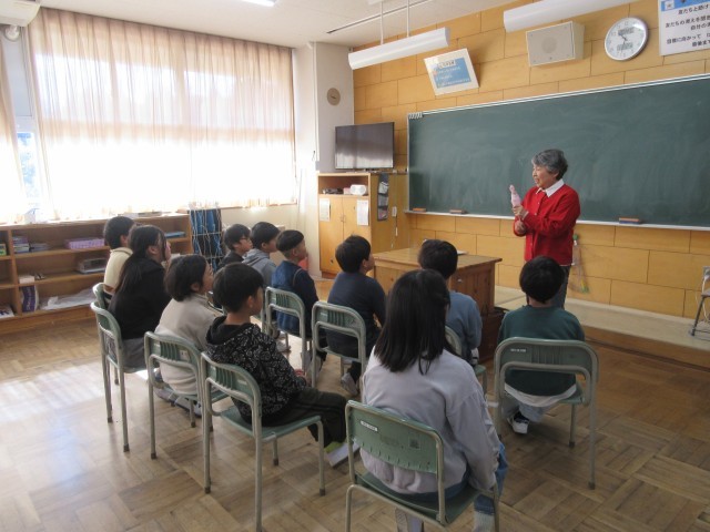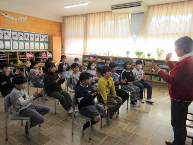3・4年生は、星 文子先生による「お話会」を行いました。戦争に関わる絵本や科学読み物、宮沢賢治の物語など、子ども達の興味に合った本の読み聞かせをしていただきました。「三枚のお札」の紙芝居や手遊び歌も交えながら、楽しい時間を過ごすことができました。