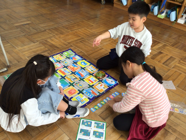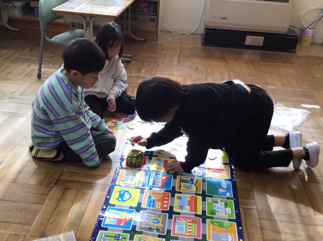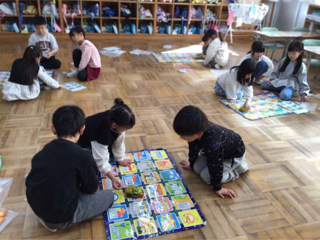 今日はプログラミングの学習をしました。まず、冒険マップ上でゴールを決め、友達と通り道を相談します。プログラミングカーに命令を登録してスタート。うまくいかなかった時は、みんなで話し合って命令を考え直し、再挑戦します。無事にゴールまで辿り着くと、「やったあ!」と歓声が上がりました。どのグループも粘り強く取り組んでいました。