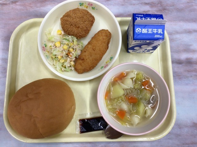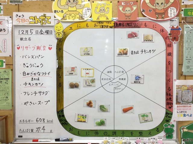 写真には、白身魚フライとチキンカツが写っていますが、子どもたちは、どちらか一つを選んでいます。