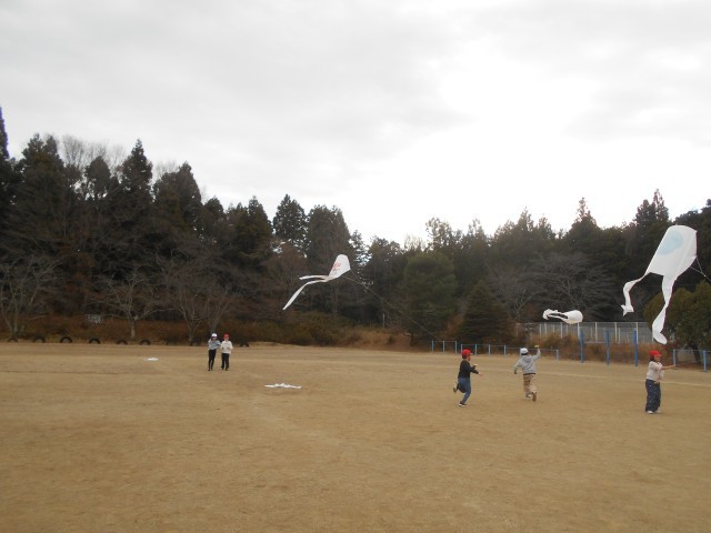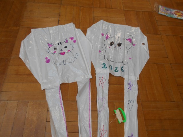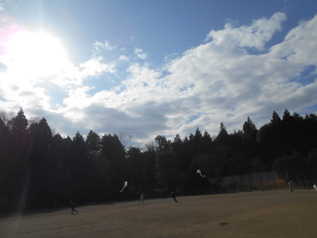 本日、生活科の時間に凧揚げをしました。凧はビニール製の「ぐにゃぐにゃだこ」です。自分の好きな絵をマジックで描き、しっぽをつけて糸を結べば出来上がりです。始めのうちは経験があまりないので、凧をうまく揚げられなかったのですが、やっているうちに上手に風に乗せて、高く揚げられるようになりました。全員、夢中になって揚げていました。