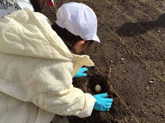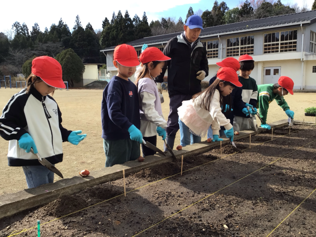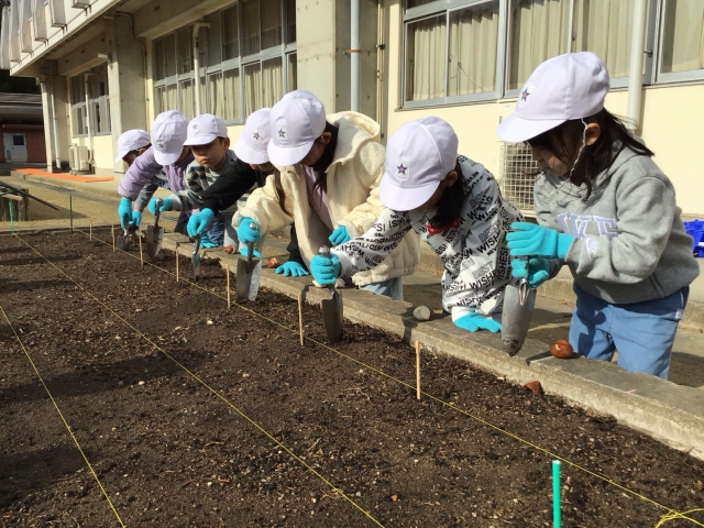 朝顔やひまわり、マリーゴールドなどの花でいっぱいだった花壇が整備され、春の準備が始まりました。今日は1年生もお手伝いをして、チューリップの球根を植えました。用務員さんにやり方を教えてもらい、一つずつ大事に植えました。「来年度の1年生も、きれいな花壇を楽しんでくれるといいな。」