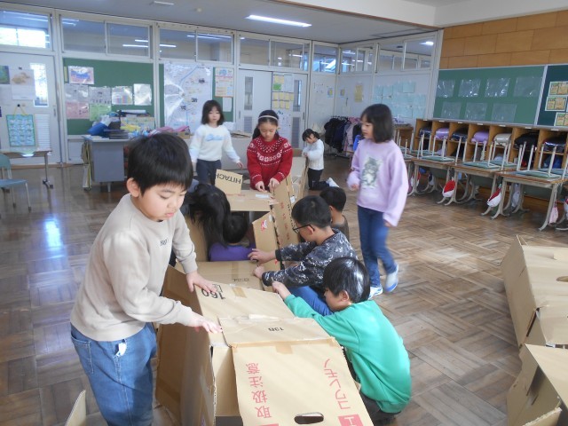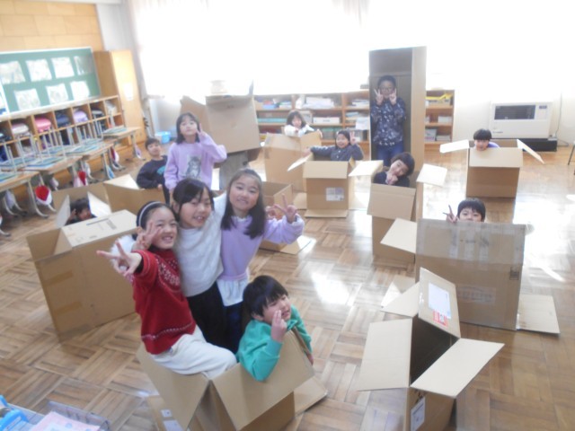図画工作科で、大きな段ボールを使った造形活動に取り組みました。まず、段ボールの中に入ってみました。一人一人がそれぞれ、中で体を丸めたり、寝転んだり、電車ごっこをしたりして楽しみました。その後、全員で協力して大きな迷路や家を作り、中に入って遊びました。全身を使って段ボールを組み立てる造形活動の楽しさを存分に味わうことができました。
