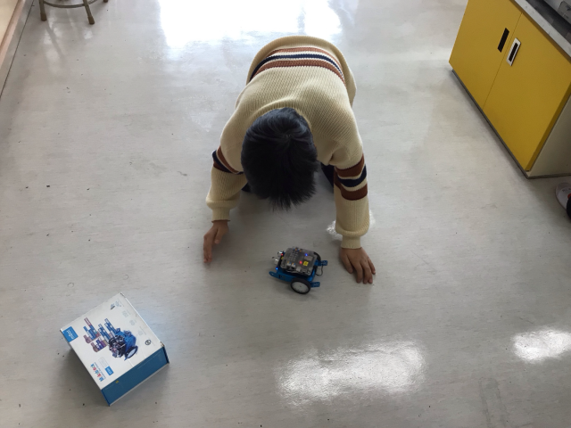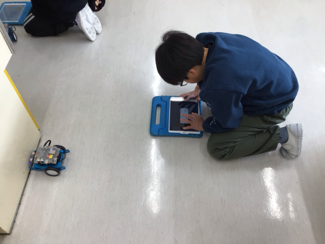4年生は、mBotを使ったプログラミング学習を行いました。超音波センサーで障害物を感知して、障害物をよけながら走るロボットをプログラミングします。どうしたらスムーズに動くか、試行錯誤しながら取り組んでいます。自分の思った通りにロボットが動くと、嬉しいですね!
