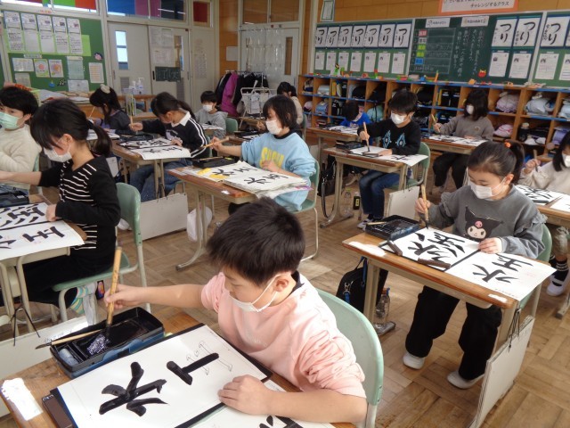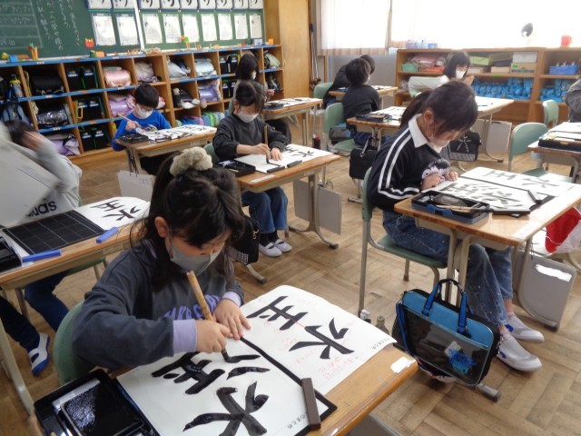 3年生から始まった毛筆の授業。筆の持ち方や墨のつけ方、筆圧、姿勢、そして「とめ・はね・はらい」など、多くのことを学んできました。その成果を生かし、お手本をじっくり見ながら一筆一筆ていねいに筆を運びます。墨の香りと張りつめた空気の中、完成した「水玉」の文字。この一年間の大きな成長が伝わってきました。