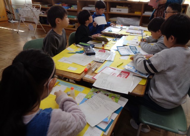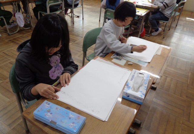 2年生は、自分の成長した点とさらなる努力が必要な点を書きだしました。それをお世話になった人に伝えるため、巻物や紙芝居、すごろくといった形にまとめています。