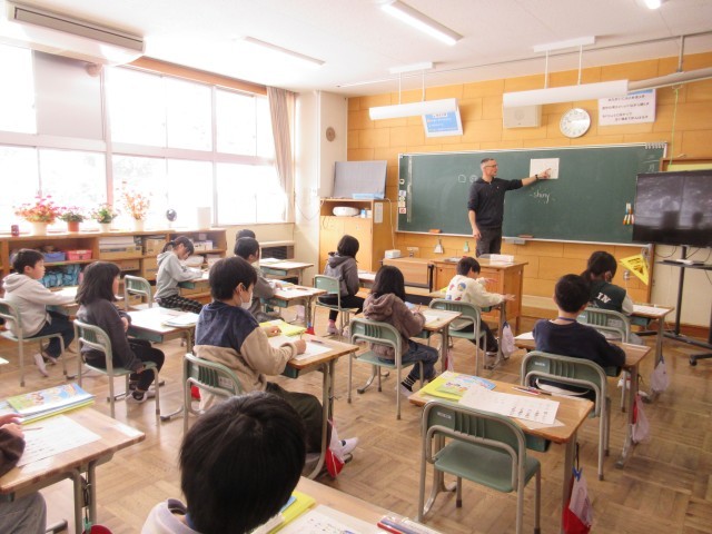 3年生は、今年度最後のジェームズ先生との英語学習を行いました。まず、3年生の学習内容の復習で、色や形、フルーツ、野菜、動物の発音の仕方を練習しました。次に、練習した単語の中から、スリーヒントクイズを作って、出題しました。クイズの答えを「panda」にしたい時は、「ヒント1 animal」「ヒント2 big」「ヒント3 white and black」のようにスリーヒントを考えます。ヒント1で正解すると3ポイント、ヒント2なら2ポイント、ヒント3なら1ポイントをゲットできます。「はい、はい!」と、たくさん発表する様子が見られました。今まで学習した単語を使って、楽しく英語の学習ができました。