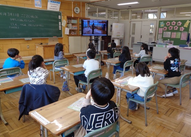 東日本大震災発生後に誕生した子どもたち。3月11日、各学級で震災に関連した授業を実施しました。福島県防災動画教材「そなえるふくしま防災塾」の視聴や、震災当時の市内の写真などの活用を通し、当時の状況を知るとともに、自分の命をどう守るか、真剣に考えていました。