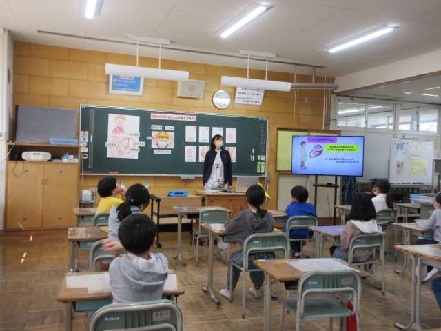 はじめに、2年生でも学習したおへその役割について振り返りました。赤ちゃんとお母さんをつなぐ「へそのお」が、とても大切であることを学びました。
