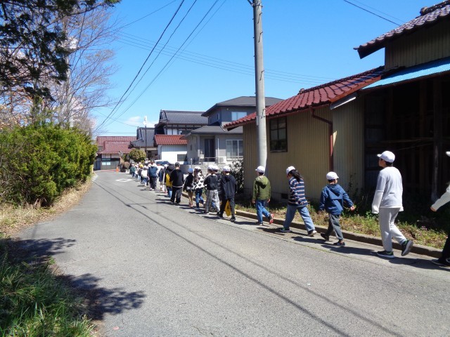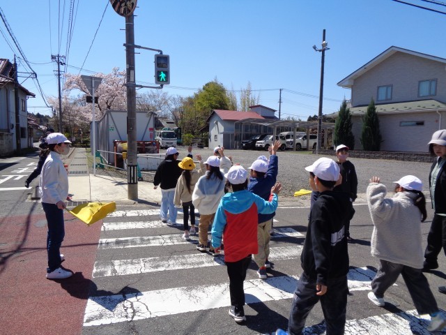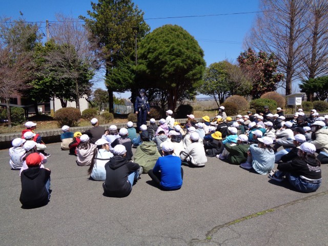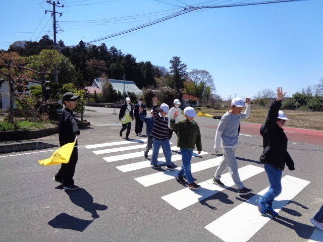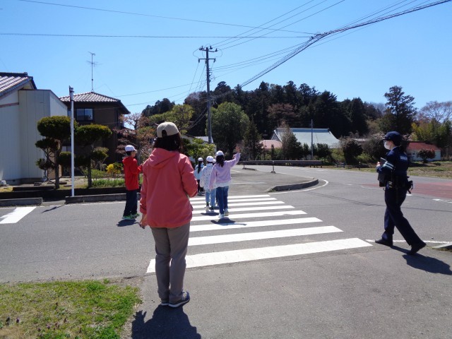 田村駐在所の方を講師にお招きし、交通安全教室を実施しました。体育館で「家庭の交通安全推進委員」の委嘱状交付や、通学班の班長への班旗授与などを行った後、実際に通学班で通学路を歩き、安全な歩行の仕方について確認しました。