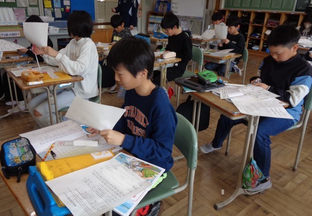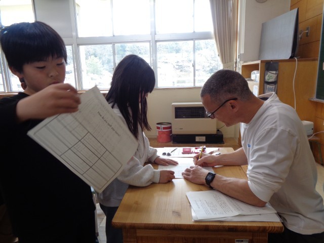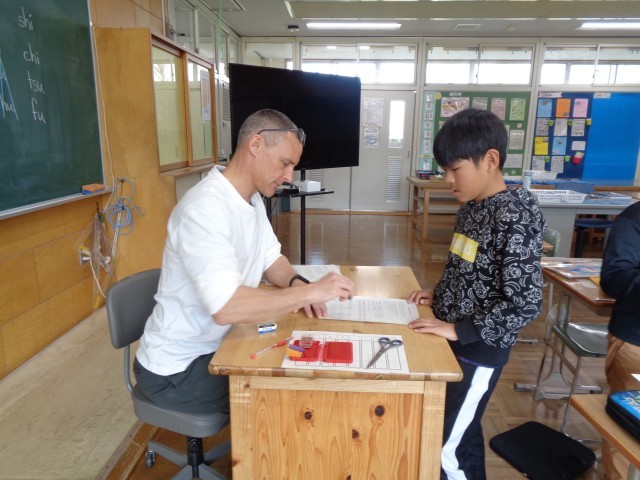 英語の4本線が引かれたワークシートに自分の名前を書き、英語指導助手の先生に一人ずつ丁寧に添削していただきました。名刺カードも作成したので、次回の授業では名刺交換会を行う予定です。自分の名前を英語ですらすらと書けるように頑張りましょう。