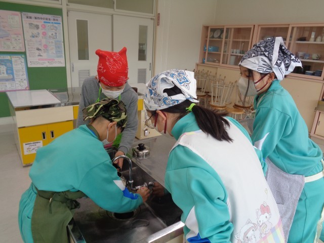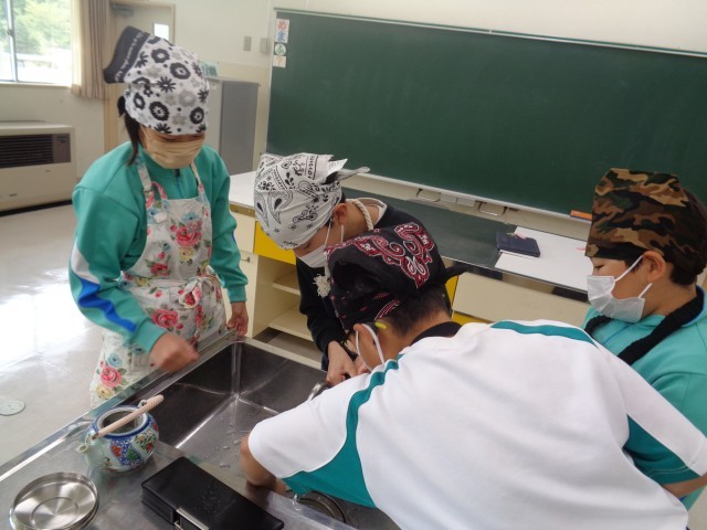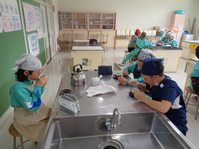 楽しみにしていた初めての調理実習は、「湯をわかしてお茶を入れよう」です。湯のわかし方や、お茶の入れ方を勉強した上での実習だったので、どのグループも上手にお茶を入れることができました。「美味しい!」という声がたくさん聞こえてきました。