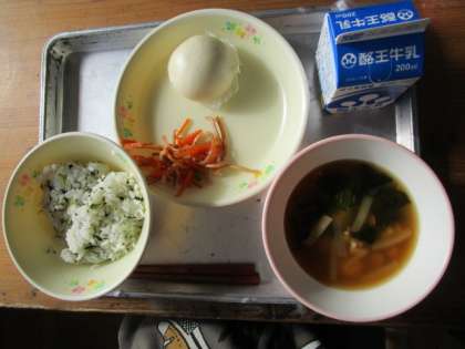 今日の給食は、菜めし、牛乳、ミニ肉まん、いか人参、白玉雑煮です。「いか人参は、おうちでもいっぱい食べたよ。」と2年生が言いました。学校の「いか人参」も美味しいですよ。