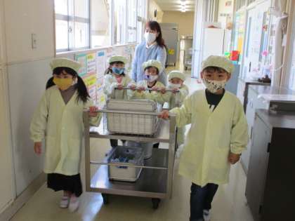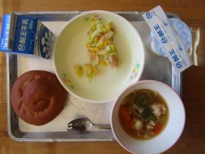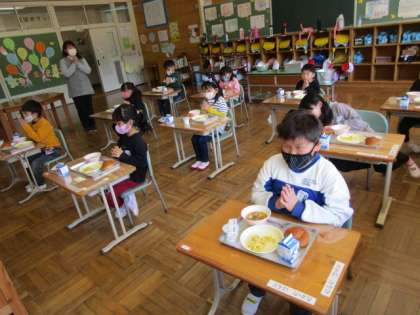 今日の給食は、黒丸パン、牛乳、挽肉団子のスープ、ツナサラダ、ヨーグルトです。1年生も上手に給食の準備をしています。男の子が、「先生、このパン丸くてカタツムリの背中みたい。このあたりにひゅーってやって目を付けたら・・・。」と、おもしろいお話をしてくれました。
