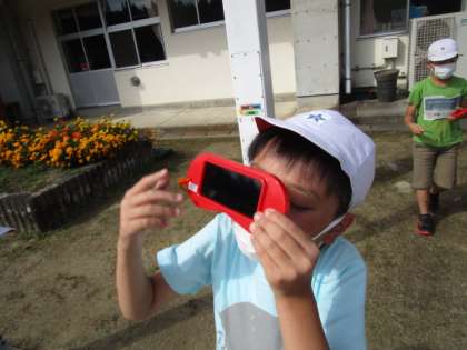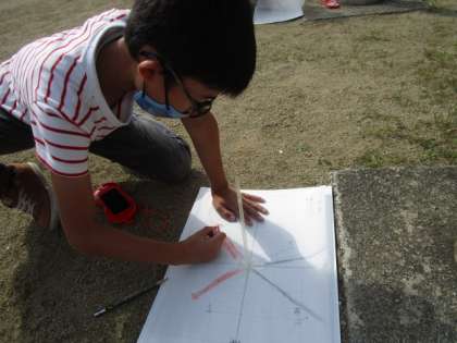 昼休みに3年生が校庭に出てきました。3年生は、「太陽とかげ」について学習中です。遮光プレートで太陽を見たり、影や太陽のある方向を時間ごとに記録したりしています。