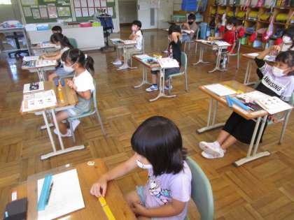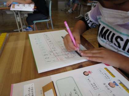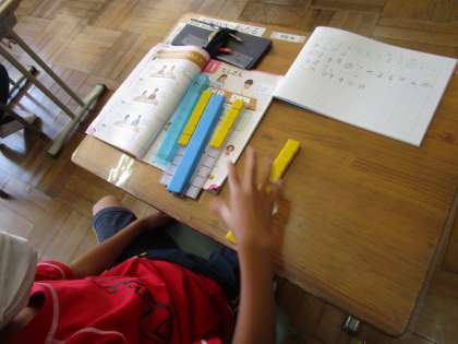 1年生は、算数ブロックを使いながら9+4の計算の仕方を考えました。「9は、あと1で10になるから、4を1と3に分けます・・・。」すぐに答えを出せる子もいますが、考え方や、計算の手順を丁寧に確認することが大事です。繰り返し確認したあと、他の問題にも取り組みました。