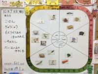 今日の献立は、「きつねうどん、大学イモ、おかかあえ、牛乳」です。
