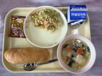 今日の献立は、「きつねうどん、大学イモ、おかかあえ、牛乳」です。