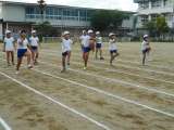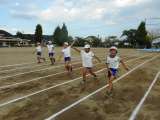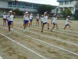 放課後、校庭では4年生以上が陸上練習に頑張っていました。今日は、リレーのメンバーを決めるためのタイムもとります。そのためには、基本が大切です。