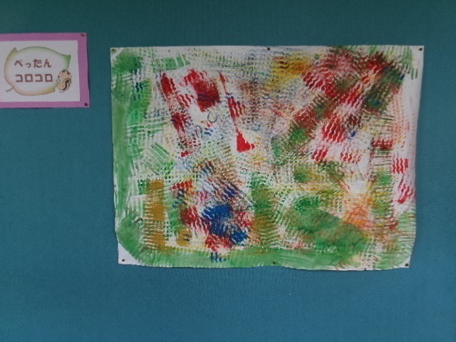 図工の作品は1年生です。「ぺったん ころころ」という題材でローラーを動かしたり、身の回りの物を使ってスタンプをして楽しみました。