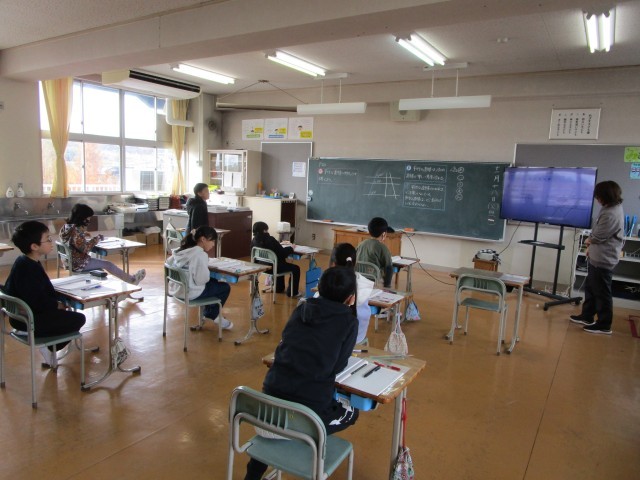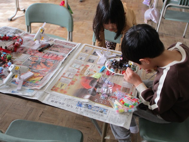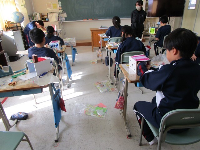 1・2年生はクリスマスリースを作っていました。松ぼっくりやアサガオのつるをベースに、ビーズや綿などで飾り付けをしました。とてもかわいらしい作品に仕上がりました。おうちでも飾ってほしいです。4年生は平行の学習でした。平行な直線は他の直線と同じ角度で交わる、どこまで行っても平行な直線は交わらないなどを確かめていました。5年生の図工は「のぞいてみると」の単元で、箱ののぞき穴からのぞくと想い想いの世界が見える(広がっている)という作品です。それぞれがイメージを広げて楽しい、個性的な作品を作っていました。