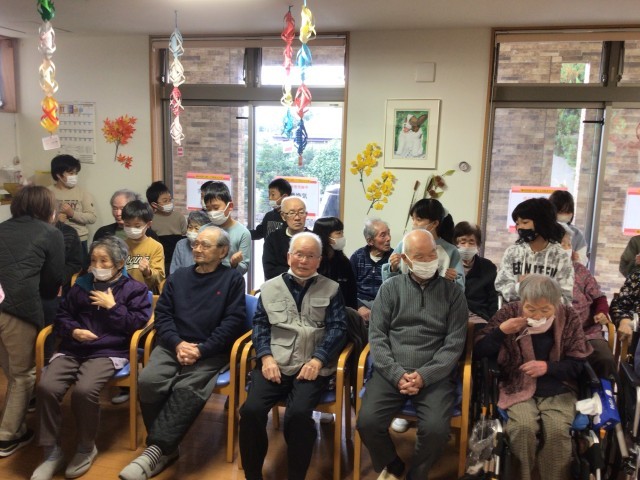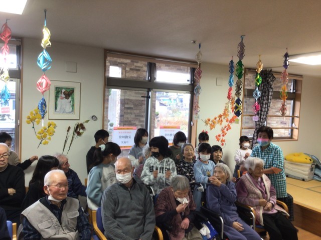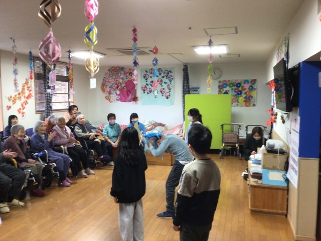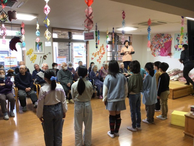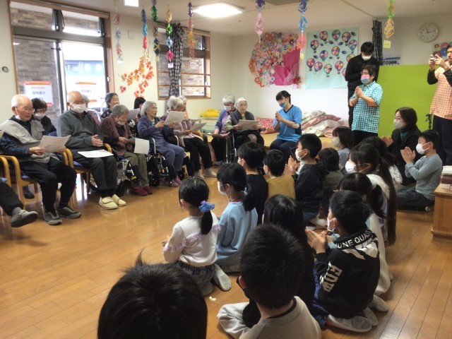 地域にあるグループホームを訪問しました。あこっぴーフェスティバルで発表した劇を発表しました。ふれあいの一つとして、肩たたきをしました。緊張した様子も見られましたが、お年寄りの方がにっこりしたり、ありがとうと言っていただいたりして、子供たちは満足した様子でした。メッセージもプレゼントしました。貴重な体験ができました。
